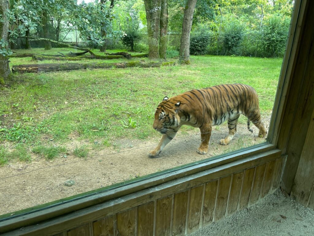 Le Monsieur Tigre qui fait les cent pas, seul, mais il y a une bonne raison, il ne supporte pas Madame la Tigresse et donc forcé d’alterner les jours dans l’enclos.