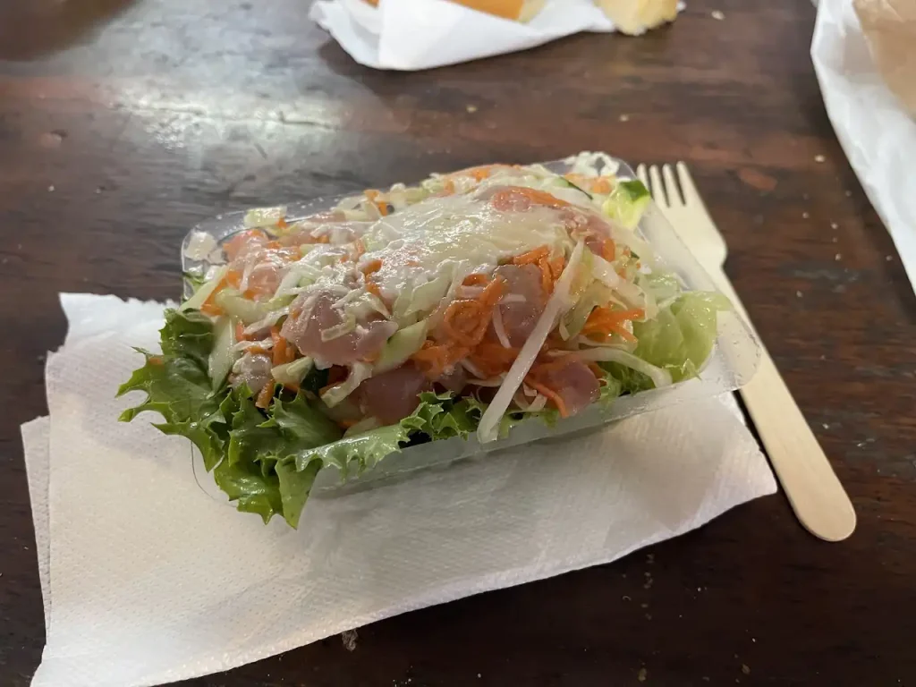 Au marché couvert, l’objectif était simple: MANGER! Et je rêvais de retrouver le stand de porc braisé, cela peut paraitre bizarre étant à Tahiti, mais malheureusement, pas de stand en semaine, donc consolation, mon premier poisson cru au lait de coco.