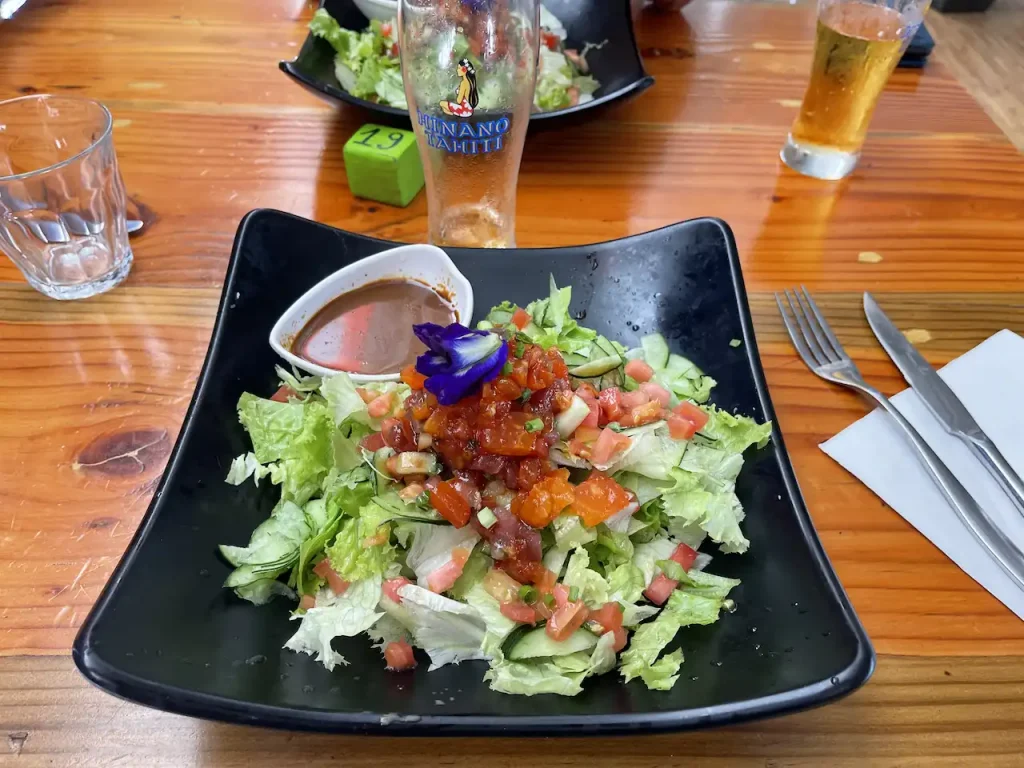 Retour au Maeva Café mais pas le même, où nous avons commandé la salade Maeva, composée de thon, tomates, concombres et sauce aigre douce. Bien sympa.